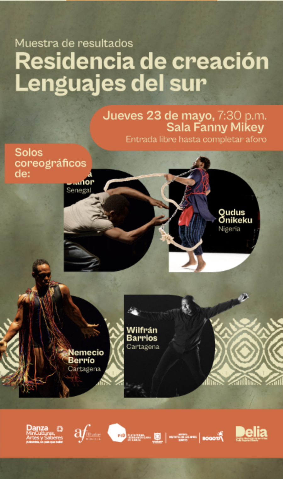 Entre el 16 y 22 de mayo, se dio lugar en el Centro Nacional de las Artes Delia Zapata Olivella, una residencia que contó con la participación de veinte jóvenes afro elegidos a través de una invitación pública: diez residentes en Bogotá y diez provenientes de otras regiones del país, entre ellos el maestro de Danza Folklórica, Henry ibarguen. Durante una semana, los y las participantes recibieron una capacitación y formación dirigida por el francosenegalés Amala Dianor, el nigeriano Qudus Onikeku y los cartageneros Wilfran Barrios y Nemesio Berrio.