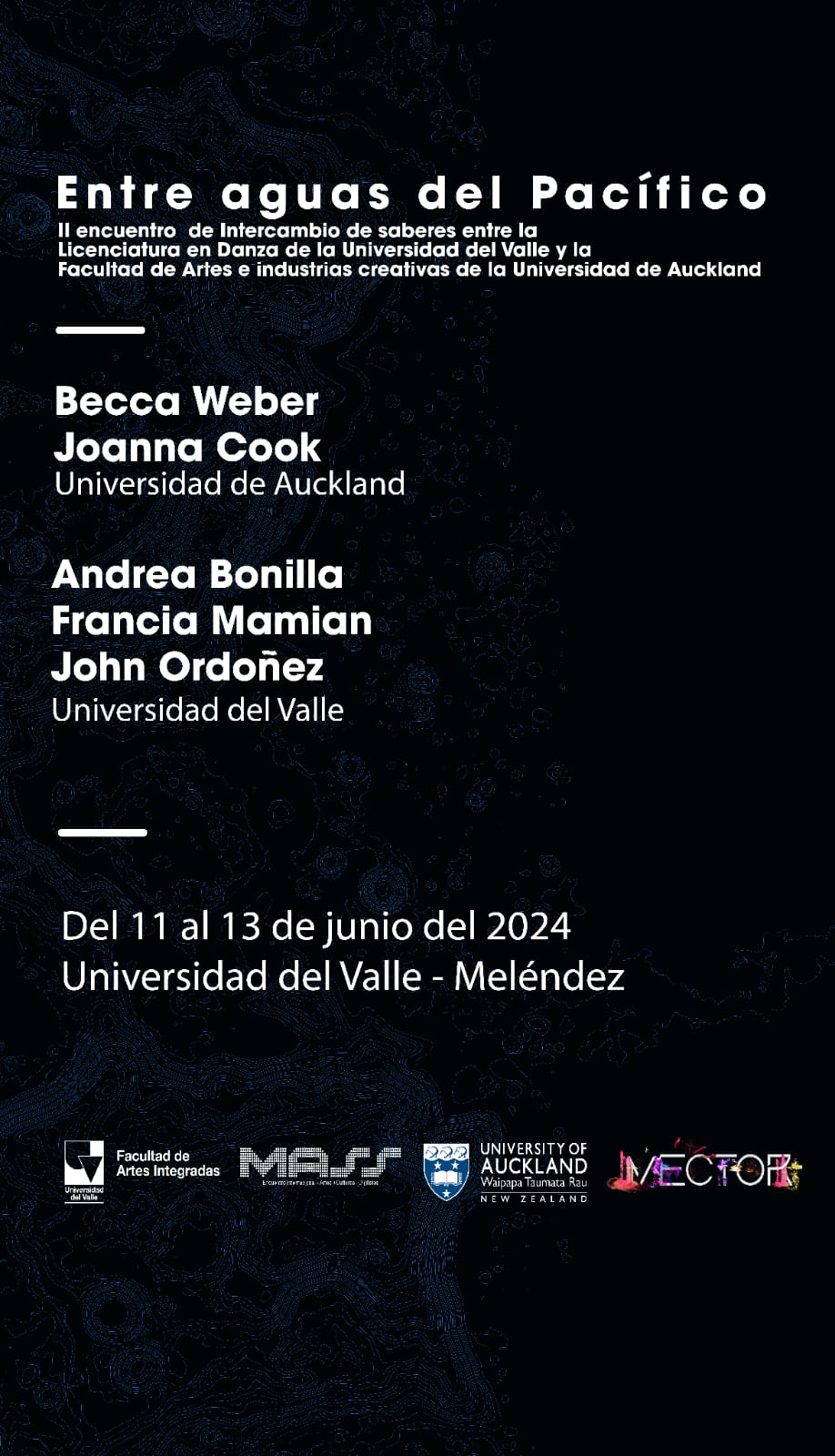Espacio: II Encuentro de Intercambio entre la Licenciatura en Danzas de la Universidad del Valle y la Facultad de Artes e Industrias creativas de la Universidad de Auckland, Nueva Zelandia.