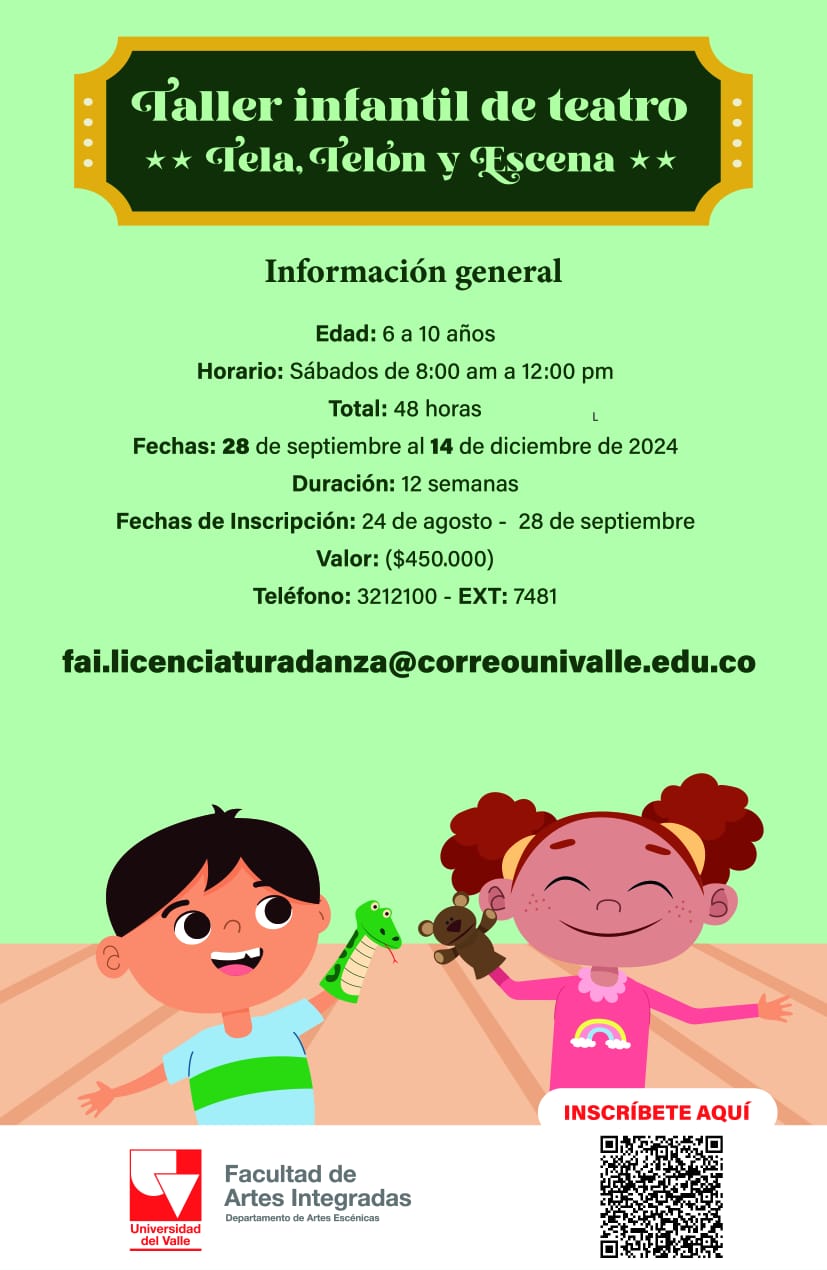 La Escena Joven La educación artística, a nivel formativo y/o recreativo, es una poderosa herramienta social y cultural para generar espacios de diversión, de participación, de integración, de juego, de exploración y, en general, sirven para potenciar las habilidades de los jóvenes. En La escena joven, el Departamento de Artes Escénicas de la Universidad del Valle, convoca a jóvenes entre los 11 y los 15 años para que descubran y disfruten los lenguajes artísticos puestos al servicio de sus capacidades creativas, interpretativas y explorativas. Guiados por el docente, los participantes recibirán una serie de herramientas básicas del entrenamiento teatral (físico, vocal e interpretativo) que contribuirán a descubrir aspectos insospechados de su cuerpo y mente.