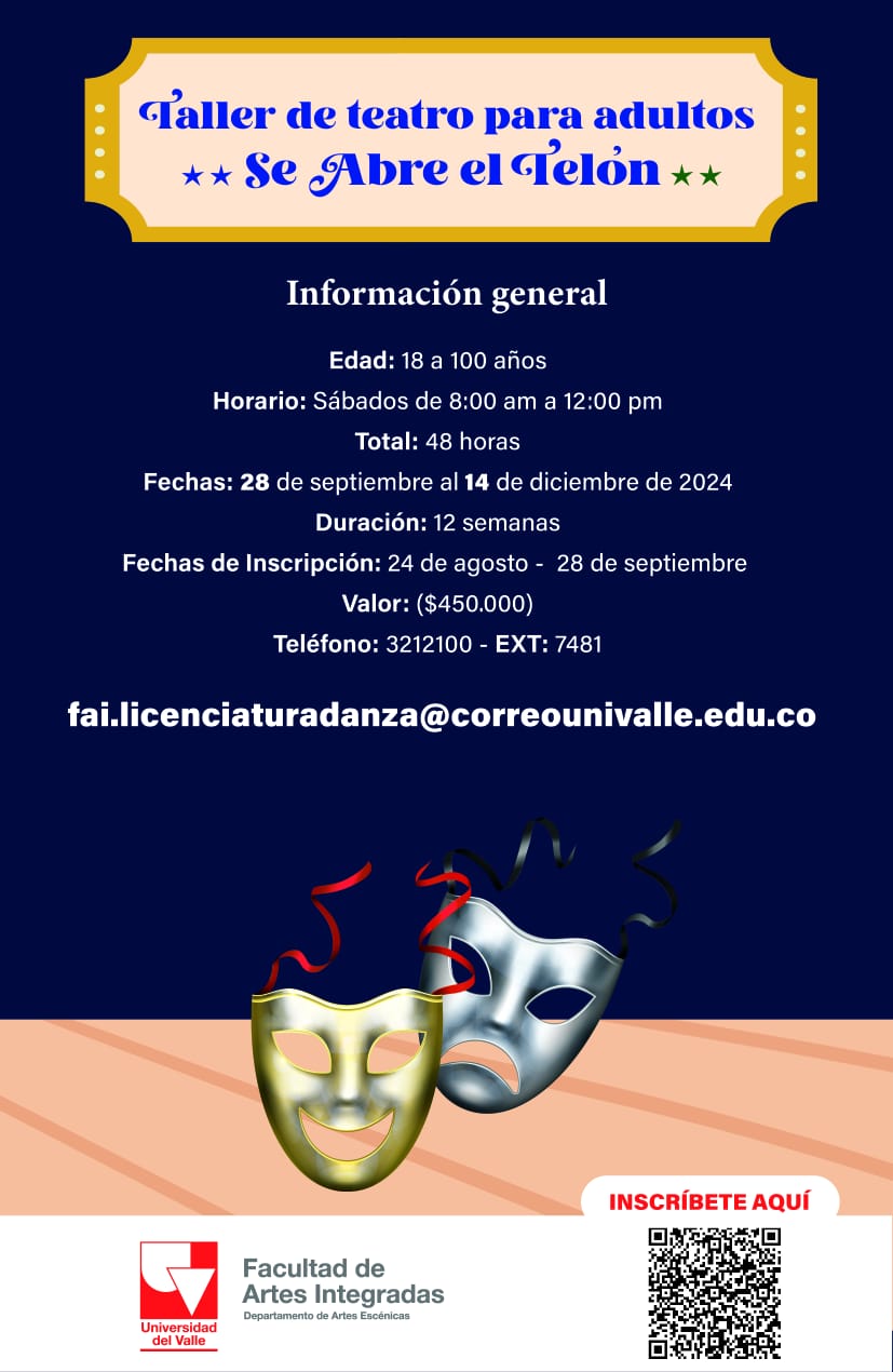 Se Abre el Telón El Taller de Teatro para adultos, Se abre el telón, es un espacio que busca despertar la sensibilidad ante los lenguajes artísticos, a partir de la lúdica y la articulación de diferentes prácticas artísticas. El juego y la experimentación con teatralidades, estrategias de composición y estructuras dramáticas potenciarán la sensibilidad del adulto, su expresión creativa y sus capacidades para representar su percepción del mundo. Diseñado para adultos entre los 18 y los 60 años en Se abre el telón los participantes descubrirán y disfrutarán los lenguajes artísticos e identificarán sus capacidades creativas, descubriendo aspectos insospechados de su cuerpo y mente.