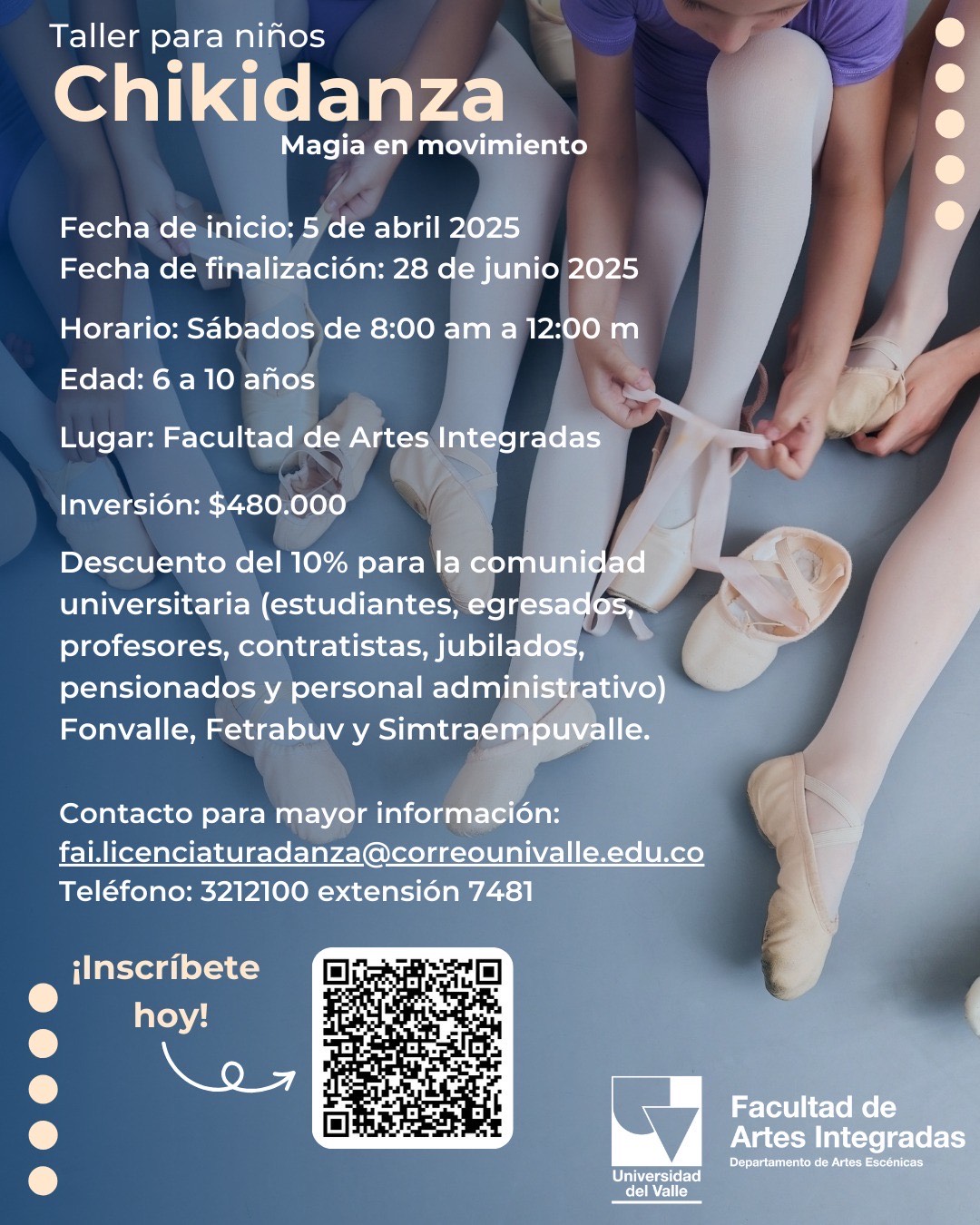 Desde el programa de Licenciatura en Danza les queremos invitar a que hagan parte de estos increíbles talleres que tenemos para ustedes, en donde tendrán la oportunidad de utilizar sus cuerpos como un espacio creativo y consciente, desde los 6 años hasta los 60.