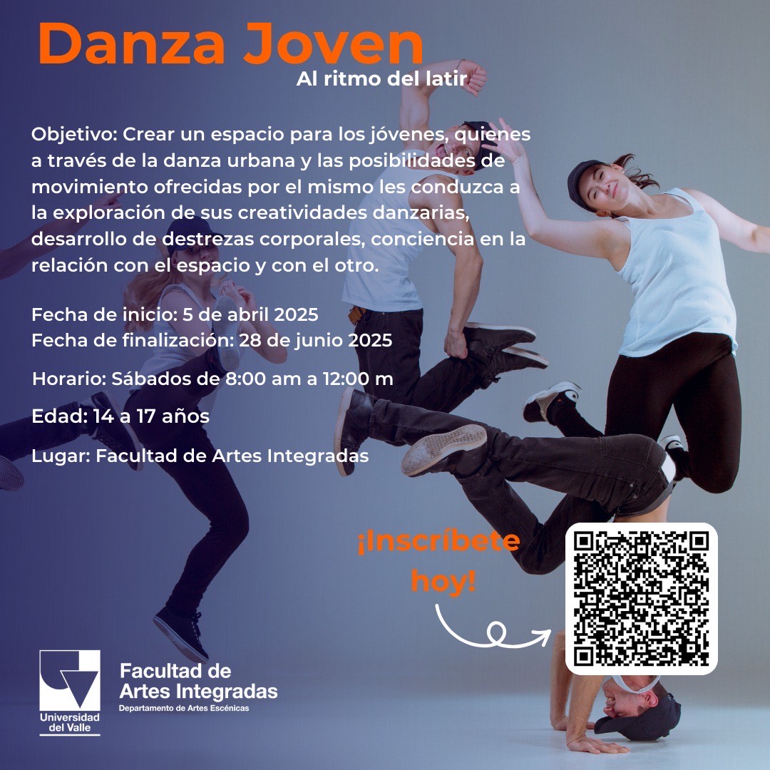 Durante este espacio se ofrecerá la oportunidad de utilizar la danza como un espacio para los jóvenes, queienes a través de la danza urbana y las posibilidades de movimiento ofrecidas por el mismo, les conduzca a la exploración de sus creatividades danzarias, desarrollo de destrezas corporales, conciencia en la relación con el espacio y con el otro. Durante este, tendrás la oportunidad de: Exploración y movilidad con diferentes partes del cuerpo, Desarrollo Corporal/ Espacio/ Formas/ Destreza, y la Alineación corporal.