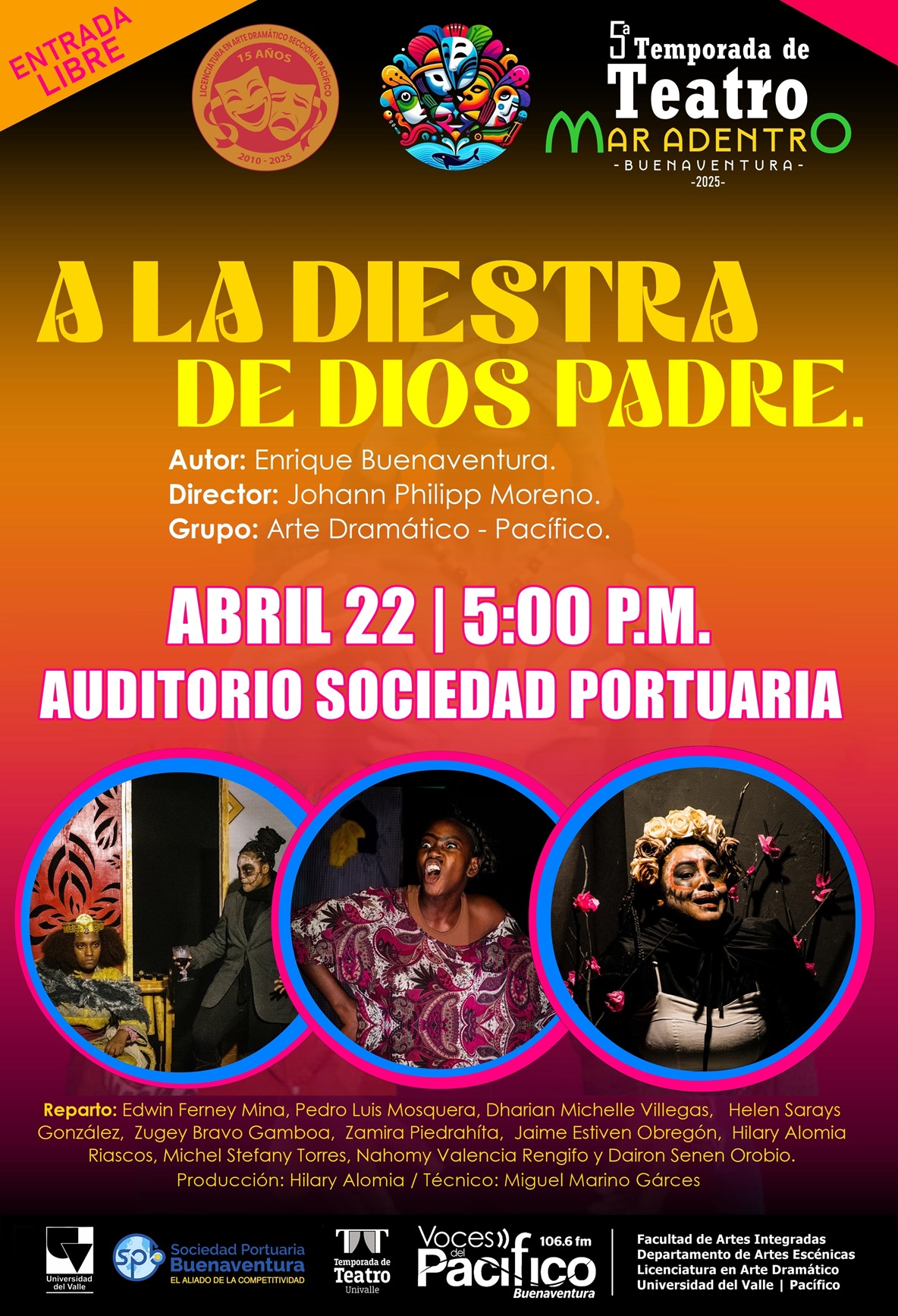 La Temporada de Teatro Mar Adentro continúa celebrando la creación escénica en Buenaventura con una de las obras más emblemáticas del repertorio colombiano, A la diestra de Dios Padre del maestro Enrique Buenaventura. Esta puesta en escena, que mezcla la tradición oral con elementos de la farsa popular, será presentada en un nuevo escenario: el Auditorio Sinfonías Yacup de la Sociedad Portuaria de Buenaventura, el 22 de abril de 2025 a las 5 p.m. La entrada es libre.