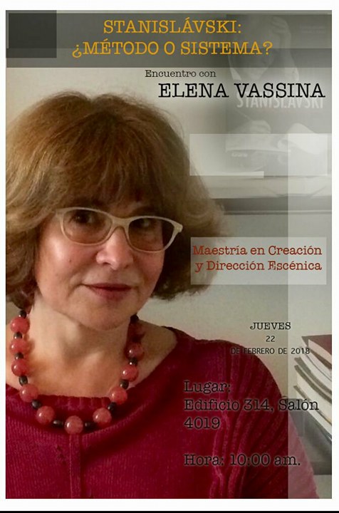 La Maestría en Creación y Dirección Escénica adscrita al Departamento de Artes Escénicas, invita a los estudiantes y egresados al conversatorio denominado “¿Stanislavski método o sistema?” con la investigadora y profesora, Elena Vassina, este jueves 22 a las 3:00 pm., en el Salón de la Maestría (Espacio 4019, edificio 314).