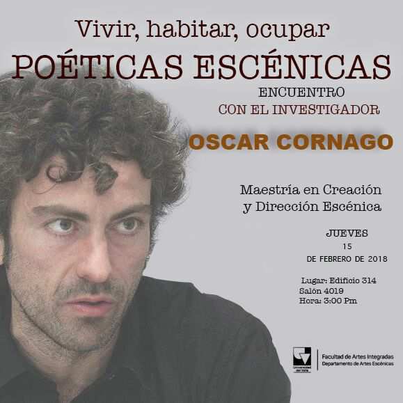La Maestría en Creación y Dirección Escénica adscrita al Departamento de Artes Escénicas, invita a los estudiantes y egresados al conversatorio denominado “Vivir, habitar, ocupar Poéticas Escénicas” con el investigador teatral, Óscar Cormago, este jueves 15 a las 3:00 pm., en el Salón de la Maestría (Espacio 4019, edificio 314).