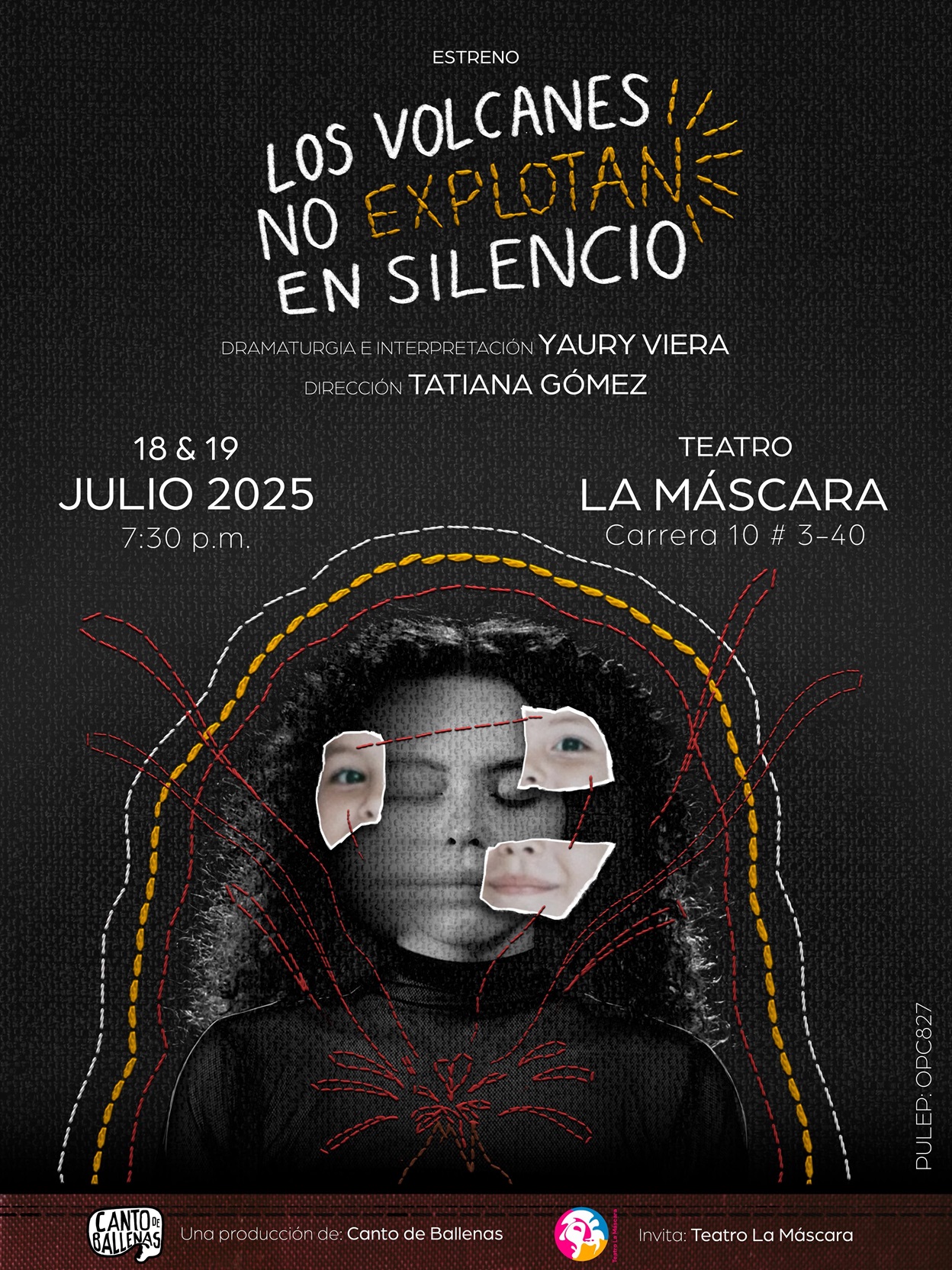 El Departamento de Artes Escénicas de la Universidad del Valle se complace en anunciar el estreno de una creación del grupo de egresados del Programa de Licenciatura en Arte Dramático, la Corporación Cultural Canto de Ballenas, la obra Los volcanes no explotan en silencio de Yaury Viera, bajo la dirección de Tatiana Gómez. Las funciones tendrán lugar este viernes y sábado 18 y 19 de julio en el Teatro la Máscara a las 7:30 pm.