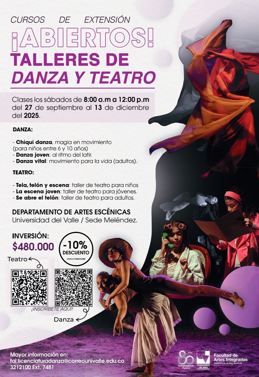 El Departamento de Artes Escénicas anuncian la apertura de las inscripciones para sus actividades de extensión, e invitan al público caleño de disfrutar sus talleres de teatro y danza para niños, jóvenes y adultos. Las clases serán todos los sábados de 8am a 12m del 27 de septiembre al 13 de diciembre de 2025.