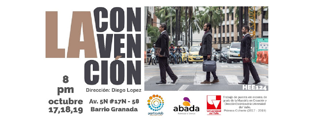 La Temporada de Estrenos de Trabajos de Puesta en Escena de Grado en Creación y Dirección Escénica (primera Cohorte, 2017-2019), programada dentro de la Maestría en Creación y Dirección Escénica de la Universidad del Valle, llega a los espacios no convencionales de Cali, con el espectáculo La convención, del norteamericano Roger Rueff y bajo la dirección de Diego Fernando López, con funciones los días 17, 18 y 19 de octubre a las 8pm en el Edificio Villacote, (Avenida 5Norte#17N-58. Barrio Granada).