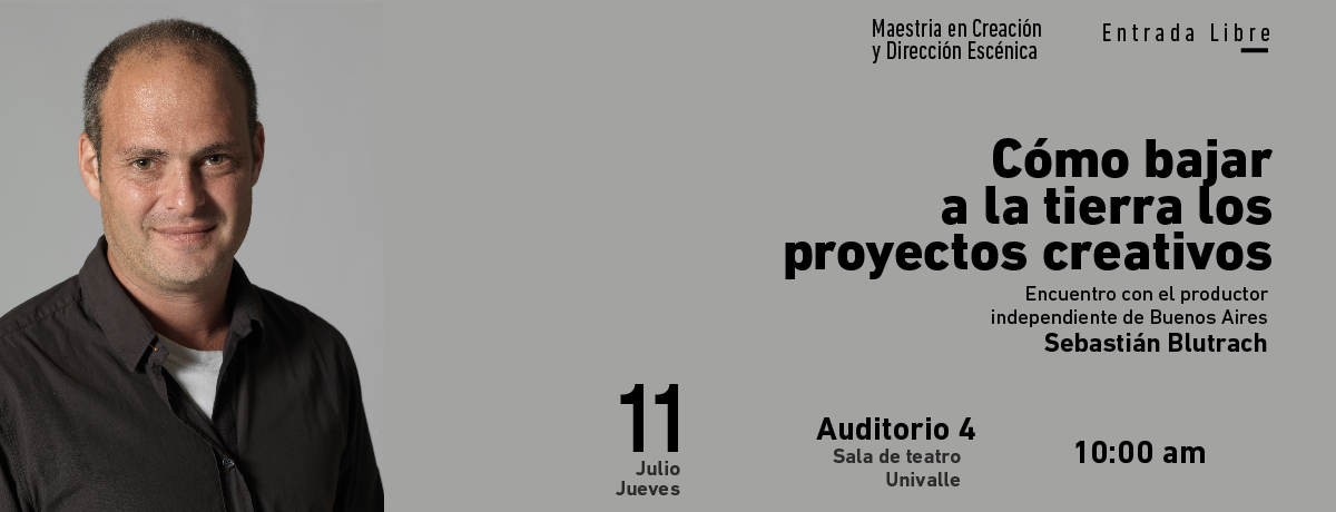 La Maestría en Creación y Dirección Escénica, adscrita al Departamento de Artes Escénicas de la Facultad de Artes Integradas, dentro del ciclo de encuentros con destacados maestros y directores, invita a los estudiantes y público en general al conversatorio denominado “Cómo bajar a la tierra los proyectos creativos” con Sebastián Blutrach, productor del teatro independiente de Buenos Aires, el jueves 11 de julio, a las 10:00 am., en la Sala de Teatro Univalle.