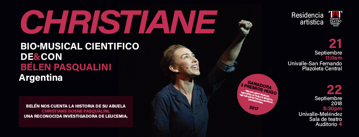 La TEMPORADA DE TEATRO UNIVALLE presenta el espectáculo Christiane, una creación que vincula el canto, el teatro y la ciencia, dirigida e interpretada por la actriz argentina Belén Pasqualini. La representación tendrá lugar en la Sala de Teatro Univalle (Auditorio 4), el sábado 22 de septiembre a las 5:30 p.m.