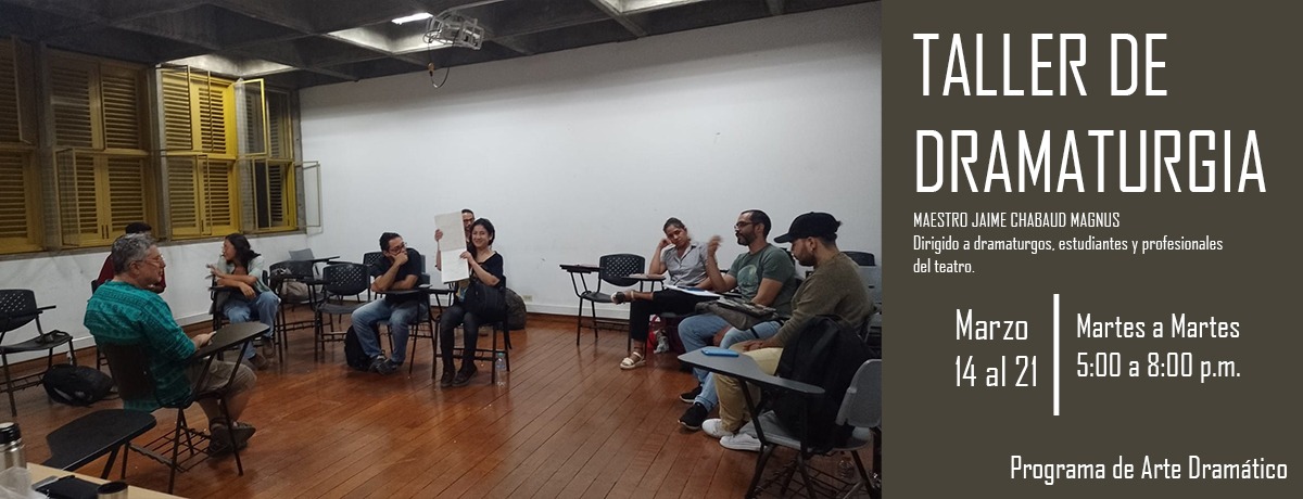 El Departamento de Artes escénicas de la Universidad del Valle ofrece el Taller de dramaturgia del Maestro Jaime Chabaud de un carácter teórico-práctico y se centra en la comprensión y construcción de algunas estructuras dramáticas contemporáneas partiendo de los conceptos básicos de carácter, situación y peripecia. El taller se dictara del 14 al 21 de Marzo de 2023 de 5:00pm a 8:00pm, Universidad del Valle sede Meléndez.