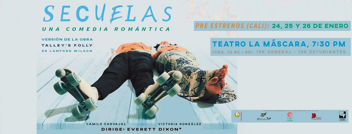 El Grupo de Investigación Teatro Cuatro Mundos anuncia el estreno de la obra Secuelas, una comedia romántica, versión de Talley’s Folly del reconocido dramaturgo estadounidense Lanford Wilson, bajo la dirección de Everett Dixon. Este proyecto, ganador de Beca de Creación Artística y Humanística de la Universidad del Valle de 2018 de la Vicerrectoría de Investigaciones de la Universidad del Valle, se hizo posible gracias a la colaboración con el teatro bogotano Anhelo del Salmón en co-producción con Dteatroproducciones. Se presentará en la Sala Mayolo de Casa E, del 6 de febrero al 9 de marzo, de miércoles a sábado a las 8 pm.