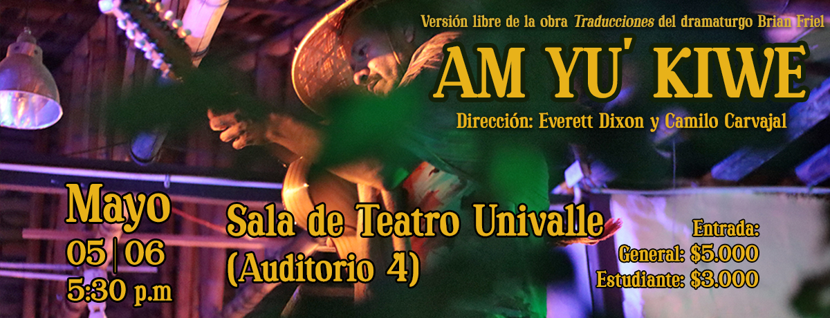 La Temporada de Teatro y Danza Univalle I-2023 presenta Am Yu' Kiwe, versión libre de la obra Traducciones del dramaturgo irlandés Brian Friel, bajo la dirección de Camilo Carvajal y Everett Dixon, y la dirección dramatúrgica de Sol Colmenares. Las funciones tendrán lugar el 05 y 06 de mayo del 2023 en la Sala de Teatro Univalle (Auditorio IV) a las 5:30 pm.