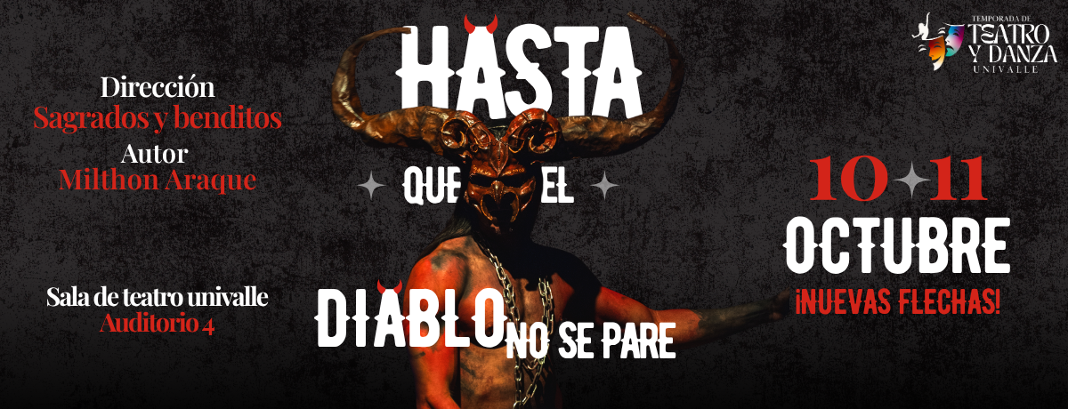 El Departamento de Artes Escénicas sigue su Temporada de Teatro y Danza Univalle 2025-2 con el gusto de invitarlos a la presentación de Hasta que el diablo no se pare, adaptación de la obra del insigne autor colombiano Milton Araque, este viernes y sábado 10 Y 11 de Octubre del 2025 en la Sala de Teatro Univalle (Auditorio IV), a las 5:30pm.